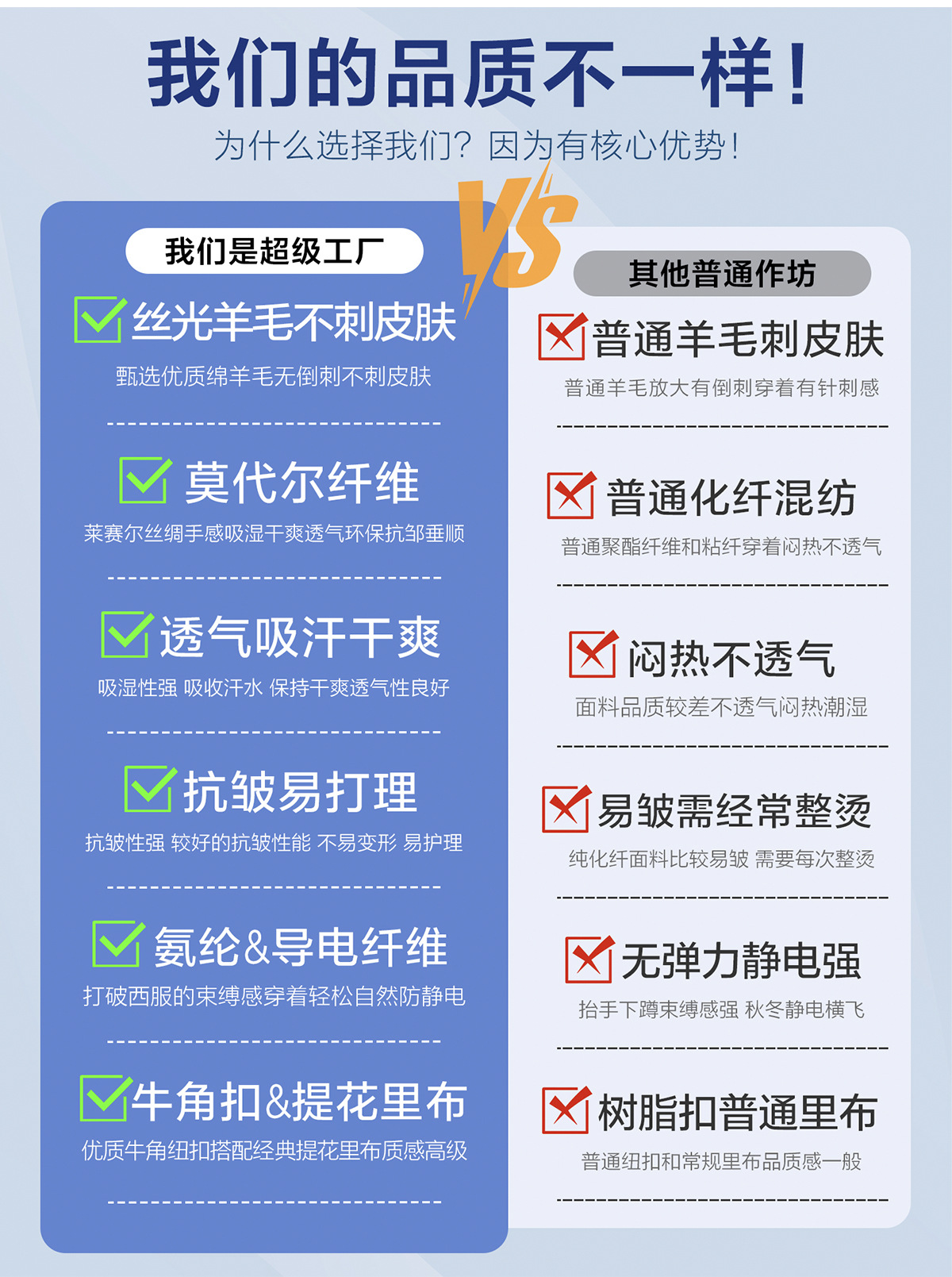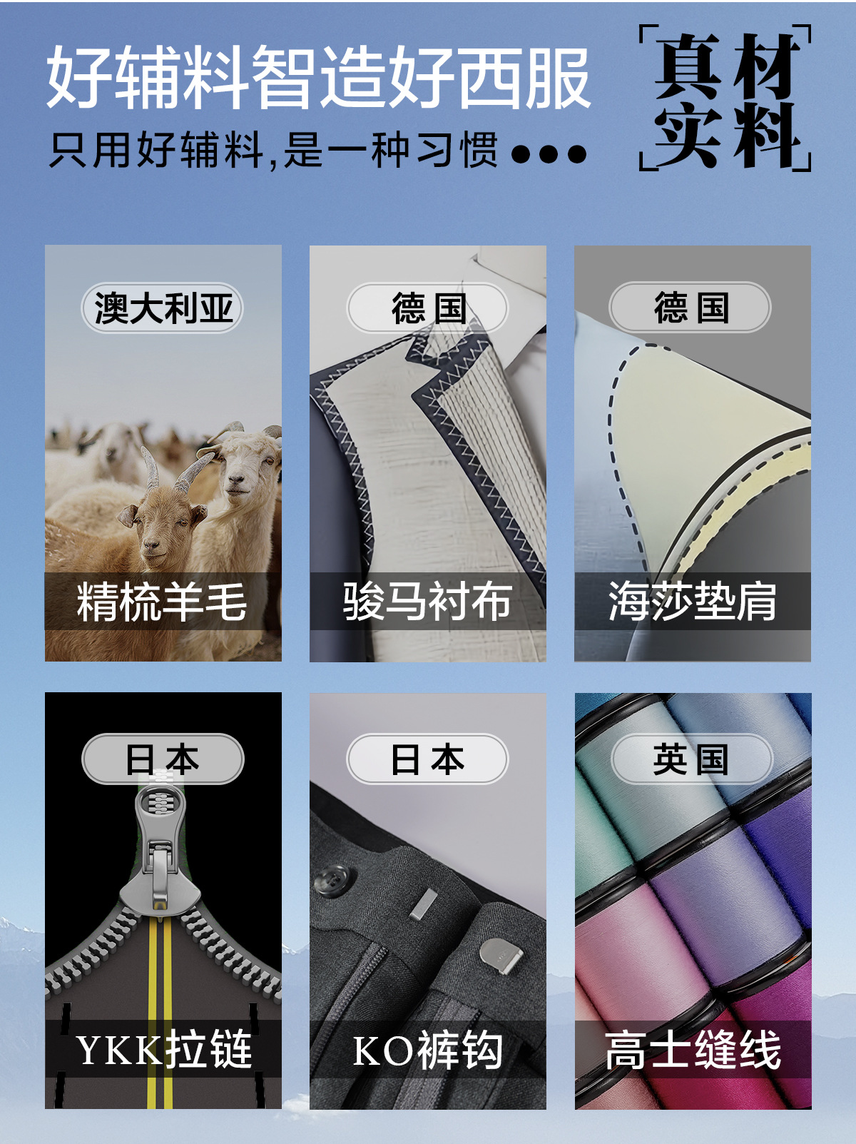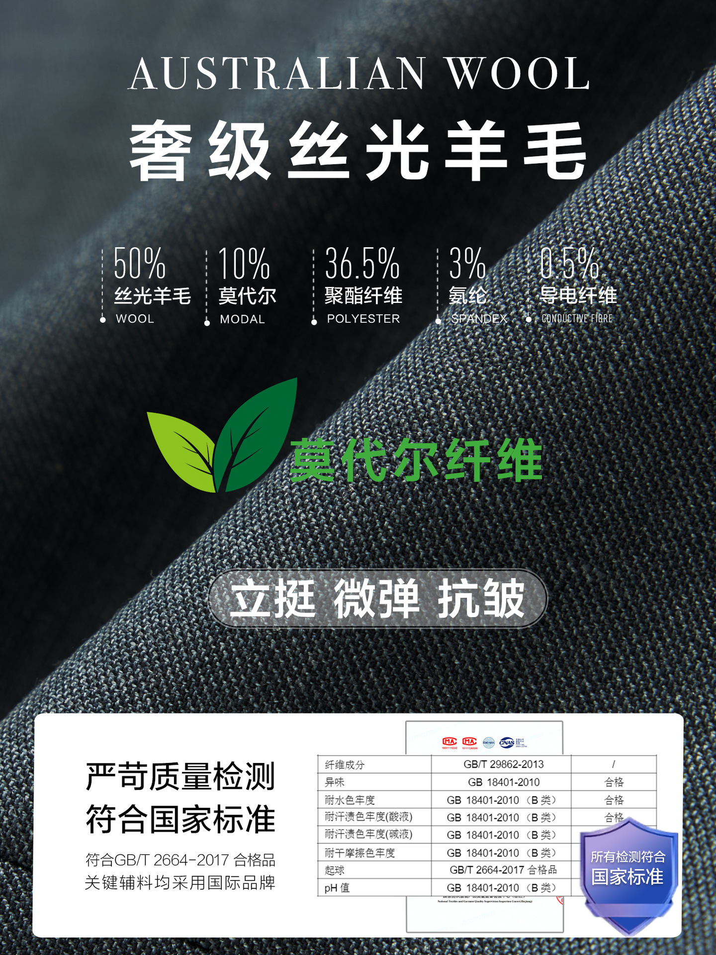 丝光羊毛不刺皮肤,莫代尔纤维,透气吸汗干爽,搞皱易打理,氨纶&导电纤维,牛角扣&提花里布。